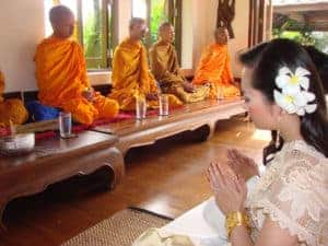 In the modern era, for the blessed rituals or for the religion's wedding ritual, the Thailand traditional wedding is usually celebrated in Buddist temple. While the Buddist monks read the pray or sing for the one wedding ritual, the groom and bride bows and worship in front of the Budha statue. The Buddist monks usually take the three shelters and the five doctrines then the Buddist monks burn the incense and the candles before the groom and bride take the pictures.